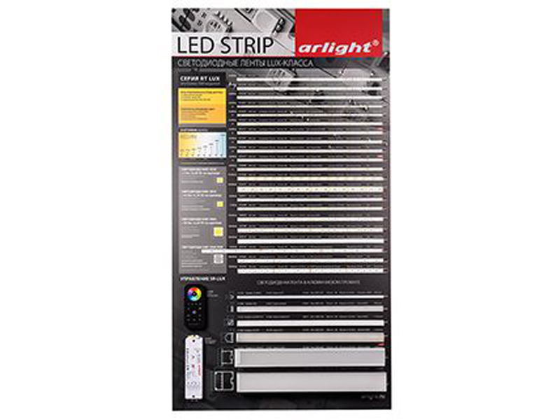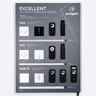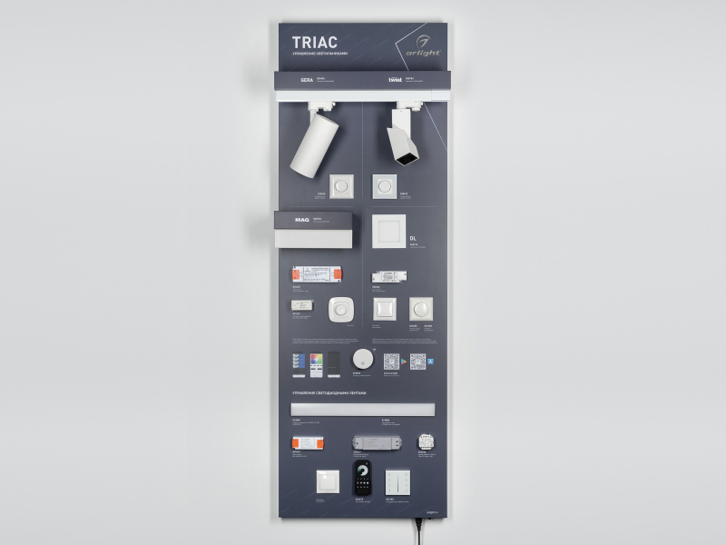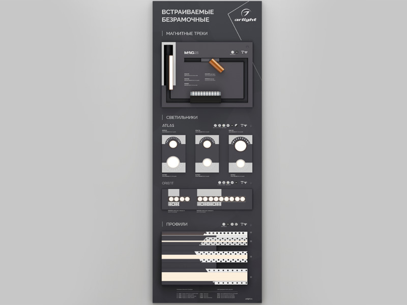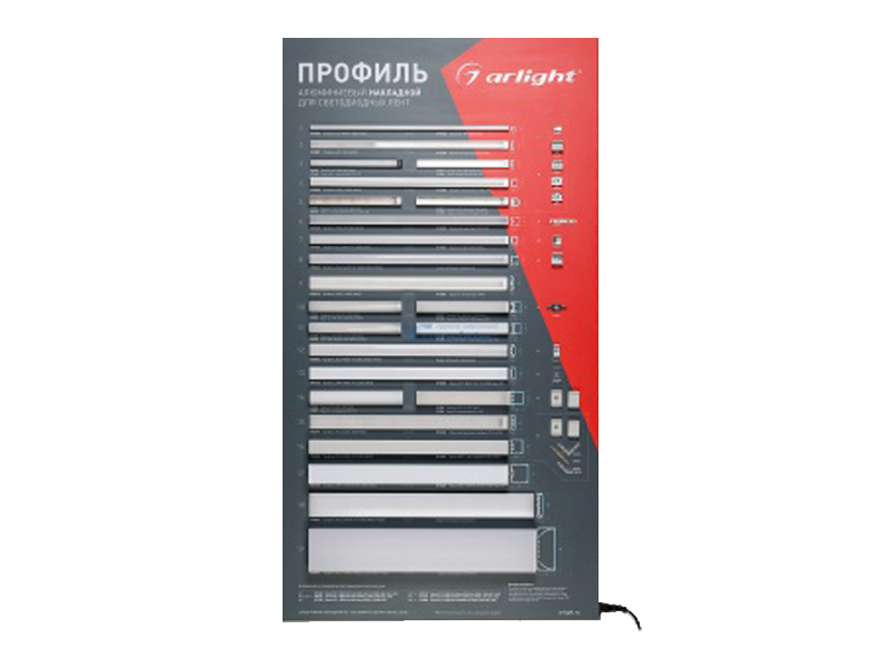 В разделе представлены презентабельные стенды для демонстрации основных категорий продукции Arlight: светодиодных лент, систем управления освещением, светодиодных алюминиевых профилей и светодиодных модулей. Демонстрационные стенды позволят быстро оформить торговую точку, представить покупателям популярную продукцию Arlight с возможностью увидеть её в работе и облегчить им выбор.